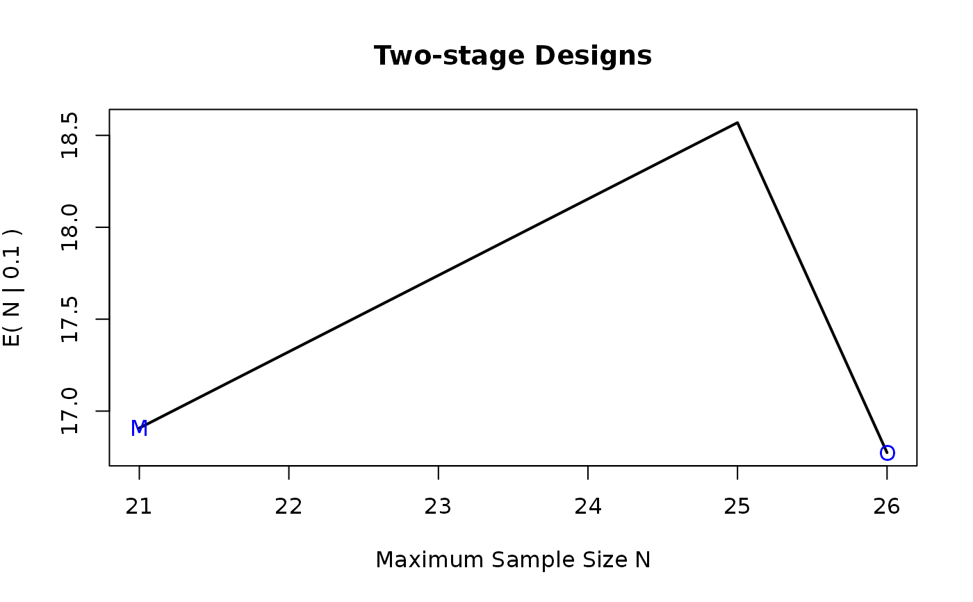 samplesize <- sargent2stage(p0 = test$p0, pa = test$pa, alpha = test$alpha, beta = test$beta,